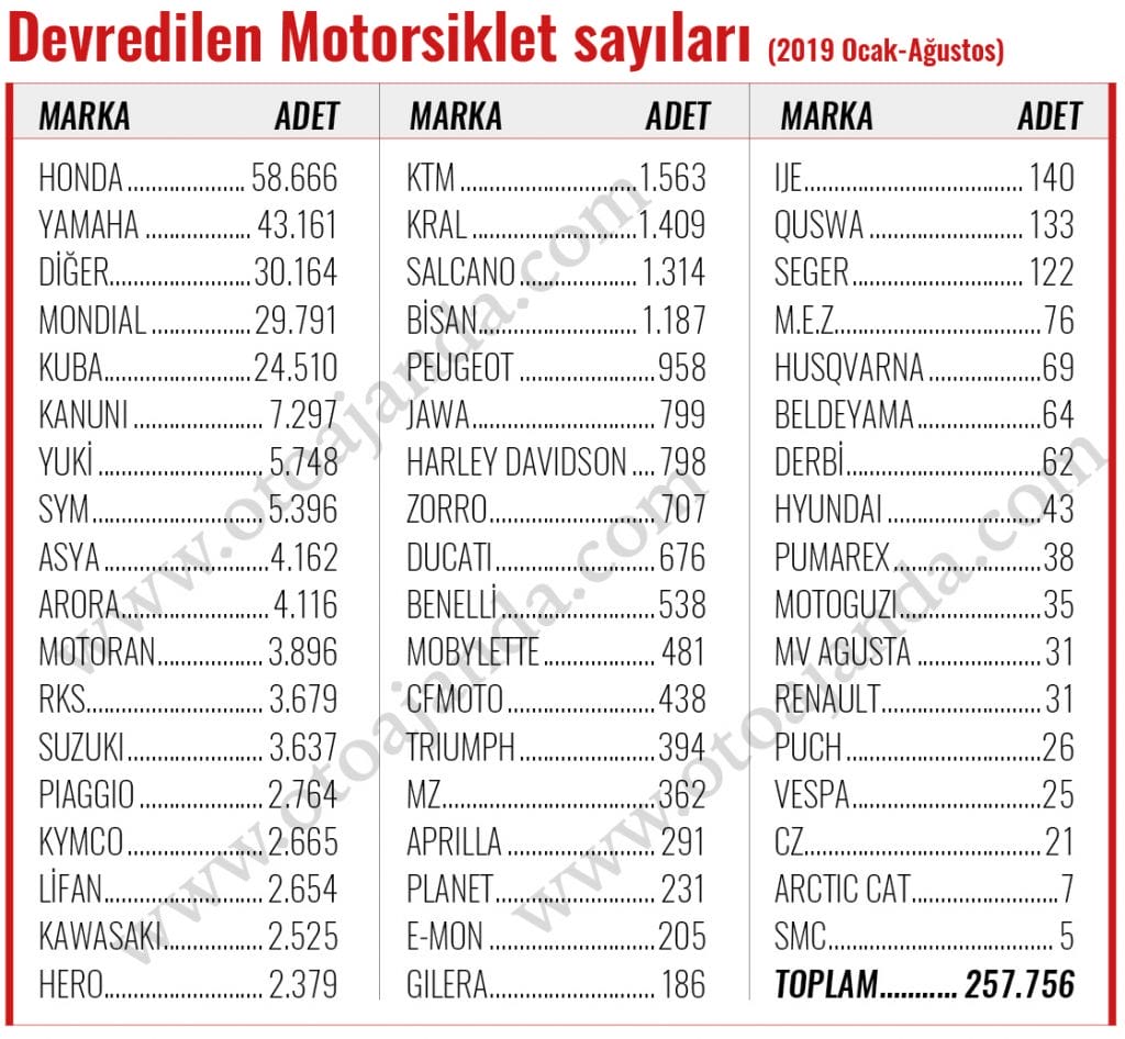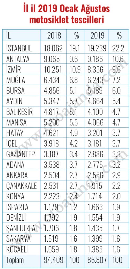 2019 yılı Ocak- Ağustos döneminde trafiğe tescili yapılan motosiklet adeti geçen yılın aynı dönemine kıyasla yüzde 9 azalarak, 111.256 adet oldu. Geçen yılın Ocak-Ağustos aylarında 122.242 adet motosikletin tescili gerçekleşmişti.
