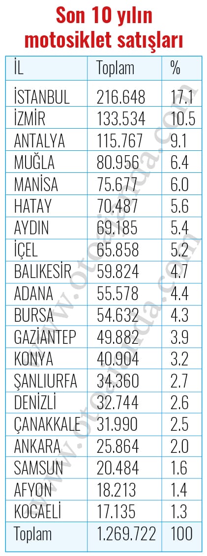 Açıklanan verilere göre bu yılın ağustos ayında trafiğe kaydı yapılan motosiklet sayısı geçen yılın aynı ayına göre yüzde 16 azaldı. 2019 yılı Ağustos ayında 13.077 adet tescil yapılırken, 2018 Ağustos ayında ise 15.484 adet tescil yapıldı.