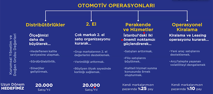 Hedefte 20 bin yeni araç satışı, 20 bin ikinci el araç satışı var. Satışların yüzde 25 payı, Doğan Trend Otomotiv’e ait perakende noktalardan gelmesi de hedefler arasında. Kiralamada ise kendi marka satışlarının yüzde 10’u kadar mütevazi hedefe sahip.