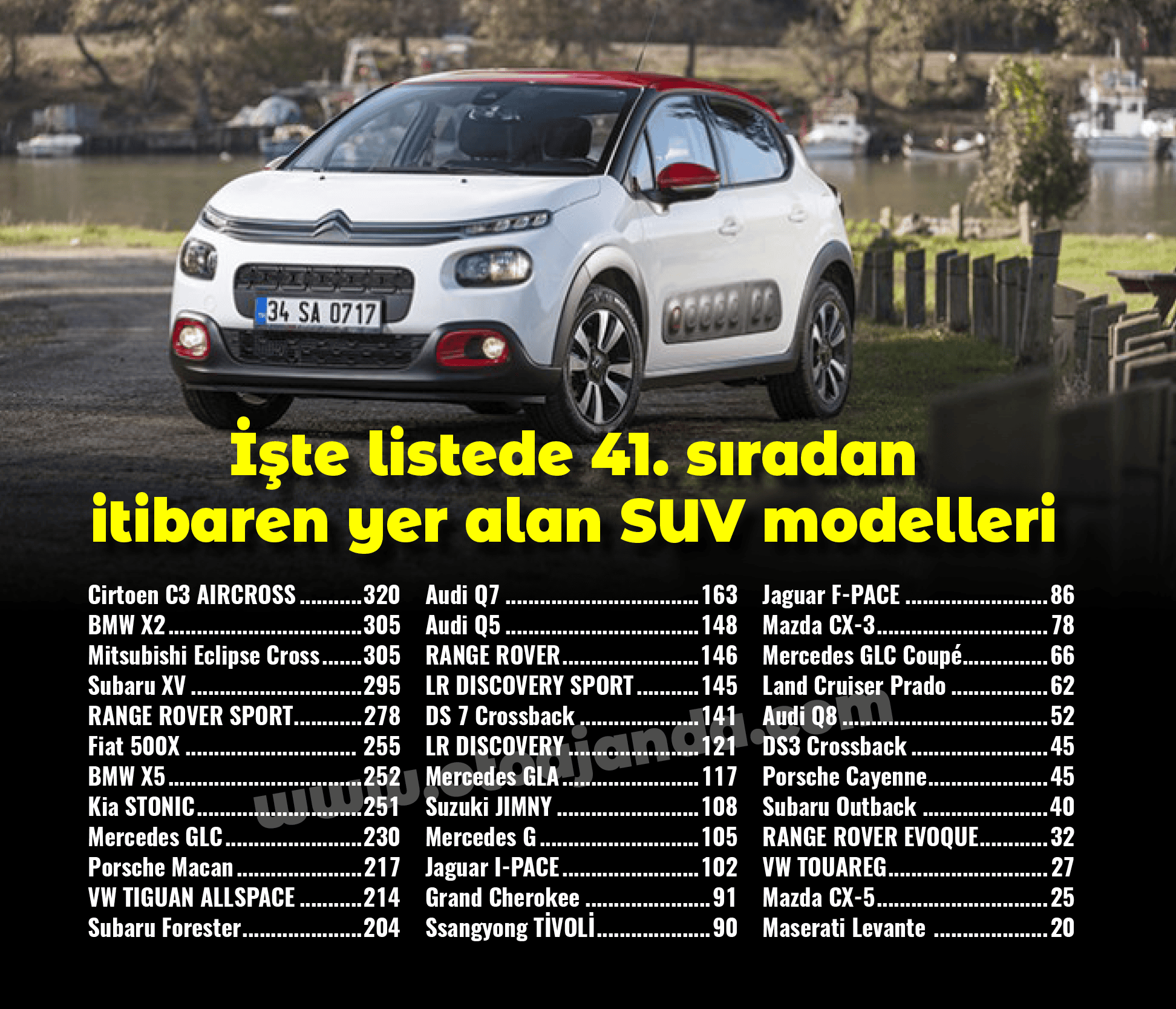 Listede 36. sırada Range Rover 357 adetle yer alırken Volvo XC60 356 adetle, Honda HR-V 355 adetle, BMW X3 328 adetle Toyota RAV4 327 adetle ilk 40 model arasında yerini alıyor.