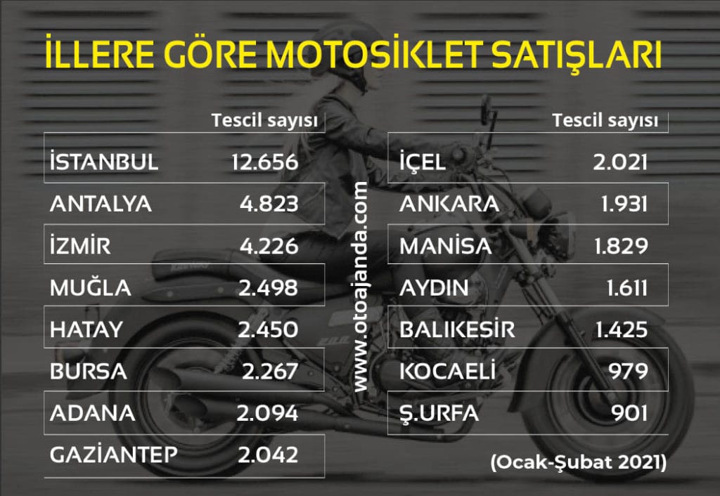 2021 yılı Ocak-Şubat döneminde motosiklet tescil adetlerinin yüzde 76’sı ilk 15 ilde gerçekleşti. 57.491 adetlik tescilin 43.753 adedi 15 ilde oluştu. Adet bazında ilk sırada İstanbul yer alırken; nüfusa oranla ele alındığında ise Muğla öne çıktı.