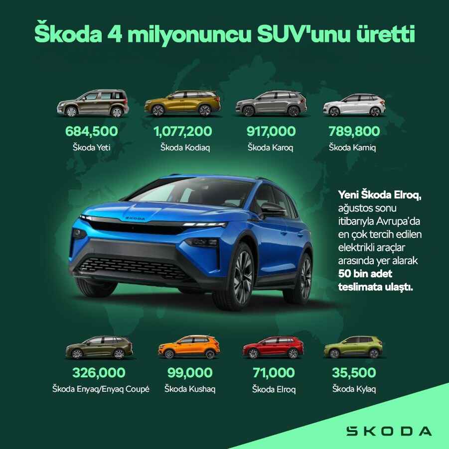 Škoda’nın mevcut 12 model serisinin yedisi SUV segmentinde yer alıyor. Markanın SUV ailesi, Hindistan’a özel 4 metrenin altındaki Kylaq ve Kushaq’tan, kompakt sınıfta yer alan Kamiq, Karoq ile yedi koltuklu Kodiaq ile tamamen elektrikli Elroq ve Enyaq’a kadar uzanıyor. SUV’lar, markanın toplam teslimatlarının yüzde 55’inden fazlasını oluşturuyor.