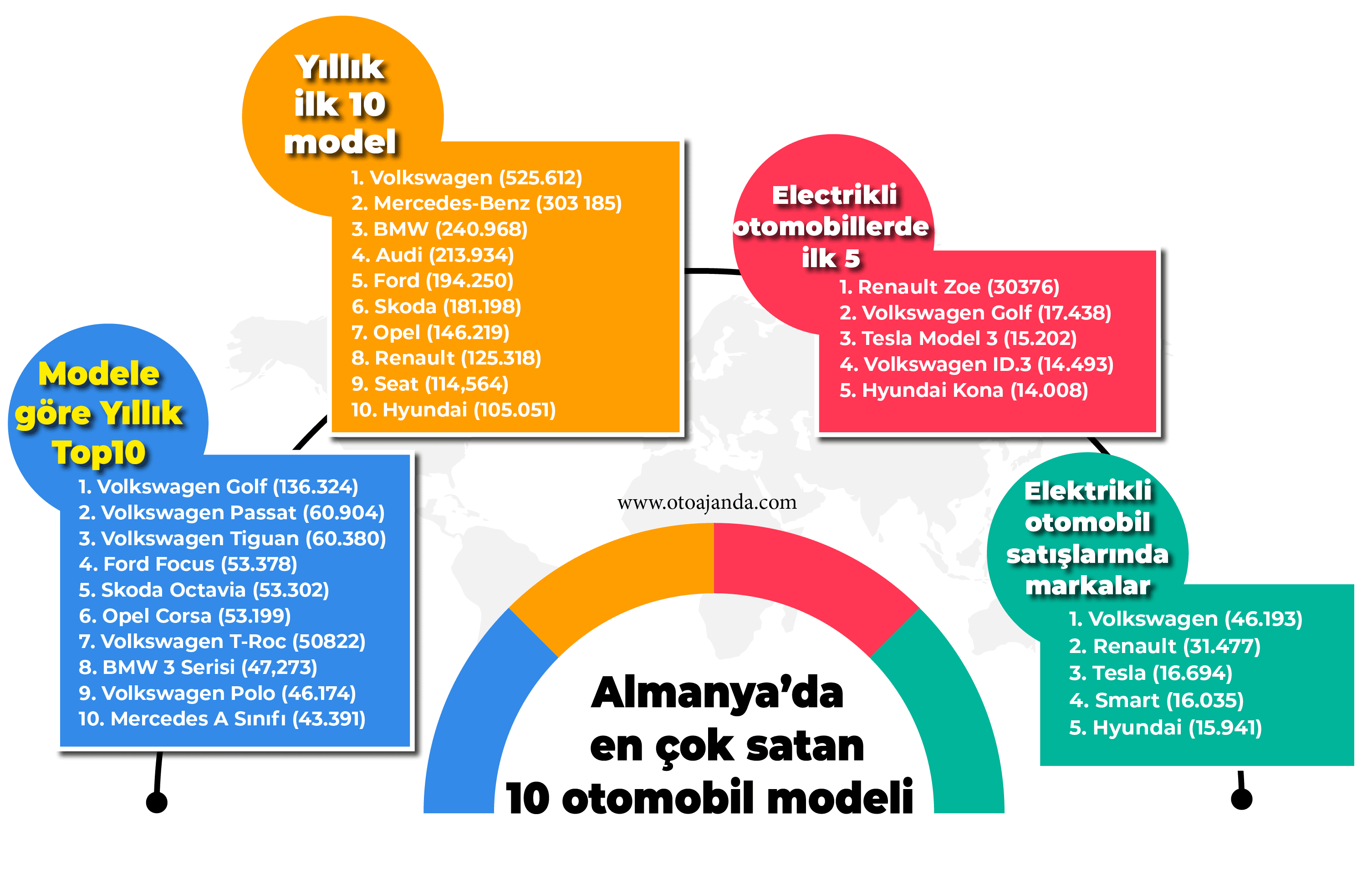Modele göre satışlarda, Golf kraliçe olmaya devam ediyor. Ancak satışlarının üçte birini kaybettiği görülüyor. En çok satan 10 otomobilden 9’u 2019’da zaten bu sıralamada yer alıyordu ve Audi A4, 10. sırasını Mercedes Class-A’ya bıraktı.