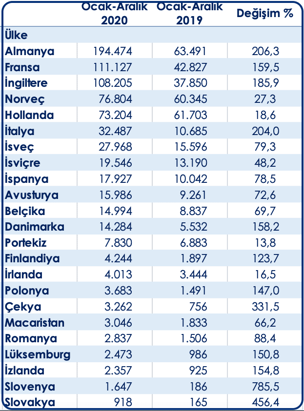 Avrupa Birliği ülkelerinde elektrikle şarj edilebilen otomobil (ECV) satışları 2019’da 180 bin 514 adetken 2020 yılında neredeyse yarım milyon adet seviyesine yükseldi. Şarj edilebilir hibrit otomobil satışları, ilk kez hibrit araç satışlarını geride bıraktı.