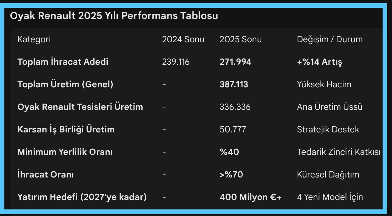 Özetle; Oyak Renault’nun 2025 performansı; yüksek teknoloji, esnek üretim kabiliyeti ve güçlü ihracat ağıyla Türkiye’nin küresel otomotiv haritasındaki yerini sağlama aldığını kanıtlıyor.