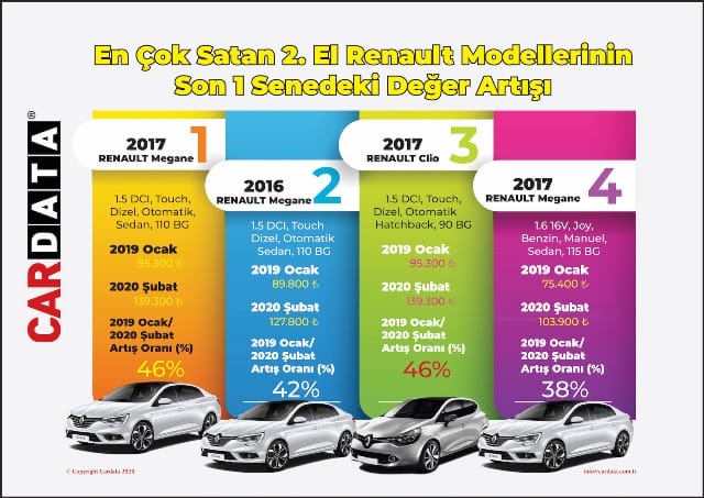Dalgalı pazar ve yükselen kur nedeniyle ikinci el otomobil fiyatları son dönemde hızlı yükseldi. Peki ikinci el otomobilde son bir yılda en fazla değer kazanan modeller hangisi oldu? Otomotiv sektörü veri ve analiz şirketi Cardata, son bir yıl içerisinde ikinci elde en çok değer kazanan marka ve modelleri listeledi. Buna göre, Türkiye’de ikinci el araçlar arasında en çok değer kazanan otomobil; yüzde 46 değer artışı ile 2017 model Renault Megane 1.5 DCI Sedan, ikinci elde değerini en çok artıran marka da Renault oldu.