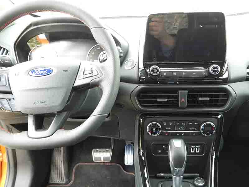 Aracın kabininde modern dokunuşlar, kalite hissi veren malzemeler ve iyi bir işçilik göze çarpıyor. Ford Ecosport tasarımcıları da 8 inçlik dokunmatik ekranı harici görünecek ekilde araca yerleştirmişler. Ben sevmiyorum bu duvardaki TV tarzı dışsal ekranları ama kullanım vb açısından sorun yaratmıyor. Aksine Apple Car Play ve Android Car Play gibi uygulamalar aracılığıyla akıllı telefonunuzu bu geniş ekranda kullanma şansı veren SYNC 3 sistemini içeriyor. BU sayede navigasyondan müzik uygulamalarına, internet radyosundan mail ve sms mesajlarına kadar telefonunuz ile ilgili her türlü özelliğe ucu direksiyonda olan sistem kanalıyla ulaşabiliyorsunuz. Apple Car Plaly sistemini kullanıyorsanız SIRI yardımıyla sesli komut sistemini kullanabiliyorsunuz. alışkanlık gerektirdiğini hatırlatalım.