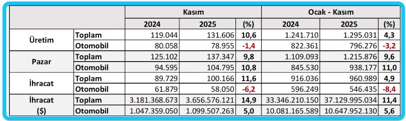 Bir bakışta otomotiv sektörü 2025 Ocak-Kasım