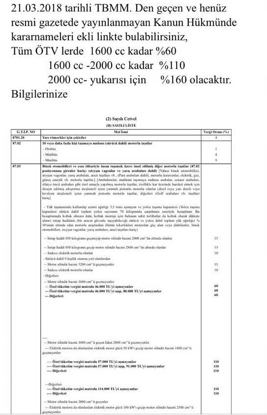 Görüştüğümüz otomotiv şirketleri üst düzey yöneticileri, belgenin gerçekliğinden şüphe ederken, bazı genel müdürler ise aldıkları bilginin doğru olduğunu, yasanın en düşük ÖTV oranını yüzde 60’a çıkardığını ama Bakanlar Kurulu kararıyla eski oranların uygulanmasına devam edileceği bilgisini ilettiler. Yani kanun daha sonra düzeltme kanunu olarak yenilenmiş.