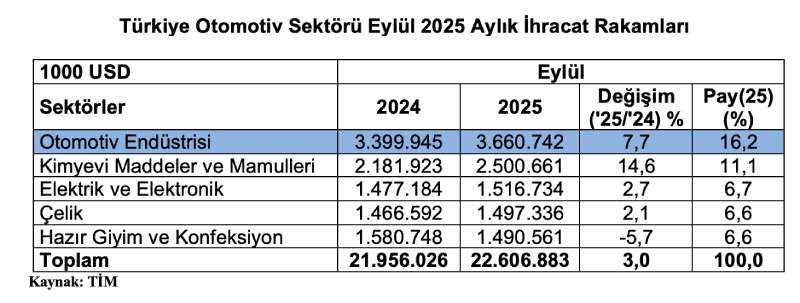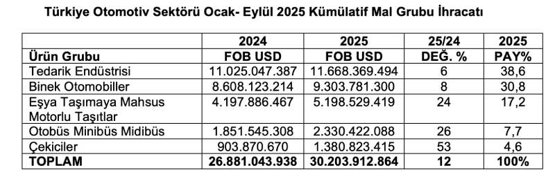 Eylülde en büyük ürün grubu olan Tedarik Endüstrisi ihracatı yüzde 5 artışla 1 milyar 416 milyon dolar olurken, Binek Otomobiller ihracatı %1 azalarak 1 milyar 77 milyon dolar oldu. Eşya Taşımaya Mahsus Motorlu Taşıtlar ihracatı %55 artışla 697 milyon USD, Otobüs-minibüs-midibüs ihracatı %30 artışla 258 milyon USD, Çekiciler ihracatı da %25 düşüşle 185 milyon USD olarak gerçekleşti.