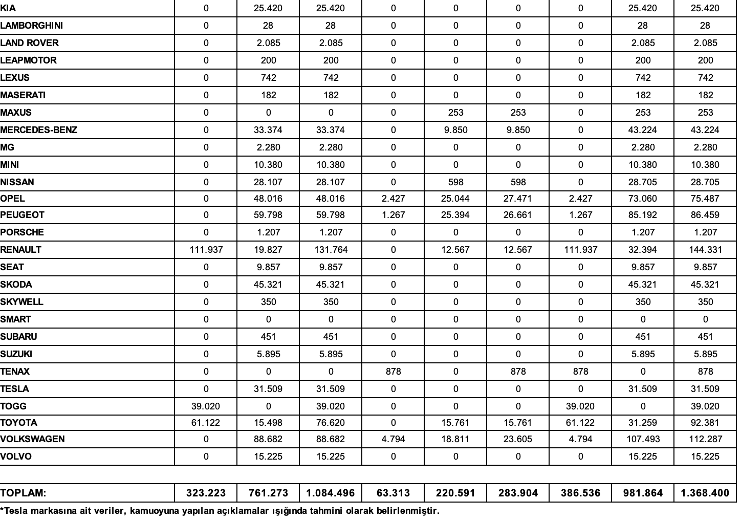 Türkiye otomotiv pazarı 191 binden fazlası elektrikli otomobil, 283 binden fazlası hafif ticari araç ve 1 milyon 84 bini binek otomobil olmak üzere toplamda 1 milyon 363 bin 400 adetlik satış ile kapandı. Bu genel görünüm içinde markaların konumlanması nasıl oldu: