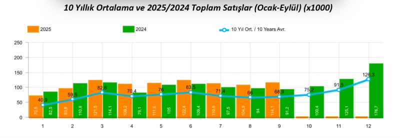 2025’in ilk 9 aylık döneminde toplam pazar, bir önceki yılın aynı dönemine göre yüzde 9 artarak 958.847 adet düzeyinde gerçekleşti. Bu dönemde, otomobil pazarı da yüzde 10 oranında artış sağladı ve 742 bin 687 adet oldu.