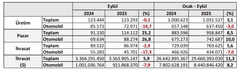 - Geçen yılın ilk 9 aylık dönemine göre yüzde 3 düşen otomobil üretimi 637.450 adet olarak gerçekleşti. Otomobil üretimindeki düşüşte artan ithalatın payı ve Hyundai ile Renult’nun yeni Ioniq 3 ve Clio üretimine geçiş yatırımlarının payı bulunuyor.