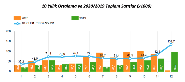 Ocak-Kasım döneminde otomotiv pazarındaki toplam satışlar, 2019 yılının aynı dönemine göre yüzde 73 artış kaydederek 688 bin 180 adet oldu. Aynı dönemde, otomobil pazarı da yüzde 67 oranında artış gösterdi ve 529 bin 388 adet seviyesinde gerçekleşti. Son 10 yıllık ortalamalar dikkate alındığında, Ocak-Kasım döneminde toplam pazar yüzde 3, hafif ticari araç pazarı yüzde 18, ağır ticari araç pazarı yüzde 36 düşüş gösterdi.