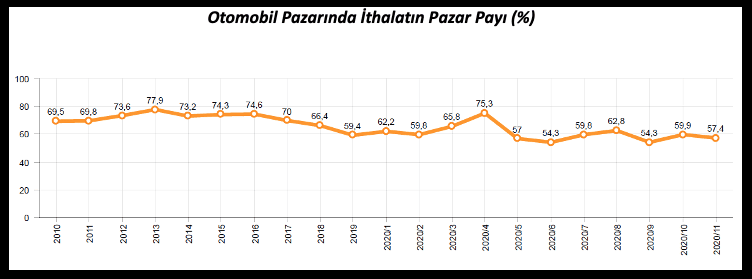 Otomobil pazarı ise iç pazardaki talebin etkisiyle 10 yıllık ortalamaların yüzde 5 üzerinde yer aldı. Bu dönemde, otomobil pazarında yerli araçların payı yüzde 40 olurken, hafif ticari araç pazarında yerli araç payı yüzde 63 olarak gerçekleşti.