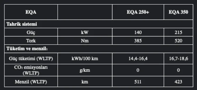 2024 başında Avrupa’da satılmaya başlanan yeni güncellenmiş model serilerinden EQA 250+’ın kombine ağırlıklı elektrik tüketimi (WLTP) 16,7-14,4 kWh/100 km. WLTP’ tüketim değerleri 17,5-15,2 kWh/100 km olarak açıklandı.